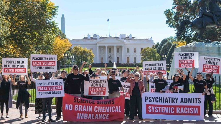 CCHR-Freiwillige marschierten in der Innenstadt von Washington, D. C., während der Mental Health Services Conference der Amerikanischen Psychiatrischen Gesellschaft (APA), um gegen den systemischen Rassismus der Psychiatrie und die Theorie des „chemischen Ungleichgewichts“ zu protestieren.
